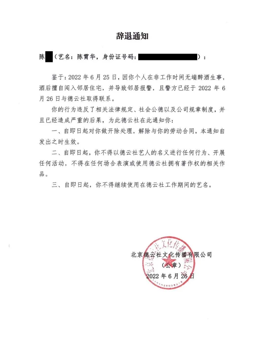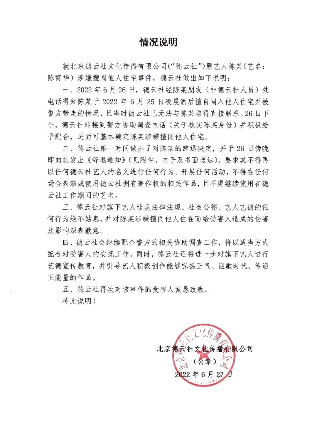 27日,@德云社 就原艺人陈某(艺名:陈霄华)涉嫌擅闯他人住宅事件,发布情况说明称,6月26日,德云社经陈某朋友(非德云社人员)处电话得知陈某于2022年6月25日凌晨酒后擅自闯入他人住宅并被警方带走的情况,且当时德云社已无法与陈某取得直接联系。26日下午,德云社即接到警方协助调查电话(关于核实陈某身份)并积极给予配合,进而可基本确定陈某涉嫌擅闯他人住宅。德云社表示,已第一时间做出了对陈某的辞退决定,并于26日傍晚即向其发出《辞退通知》。